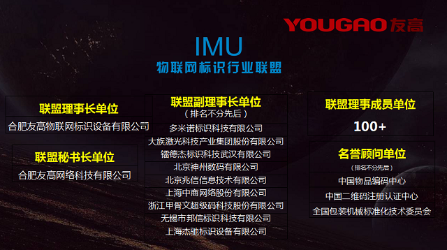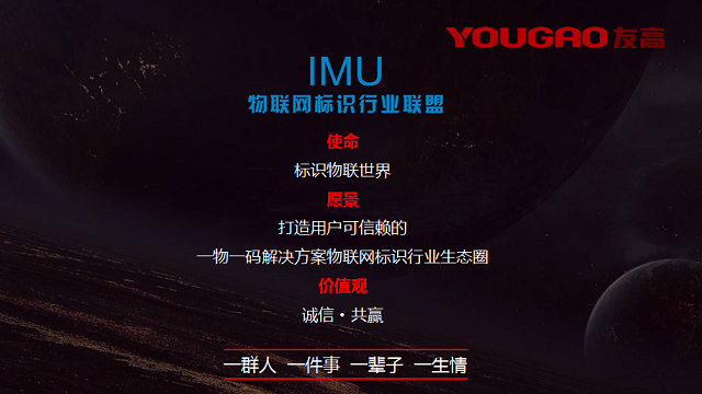 在總經(jīng)理陳文正先生的帶領(lǐng)下,友高公司不僅注重自身品牌的升級(jí)發(fā)展,更注重行業(yè)的可持續(xù)進(jìn)步,IMU物聯(lián)網(wǎng)標(biāo)識(shí)行業(yè)聯(lián)盟正是基于此而成立,友高作為IMU聯(lián)盟的理事長單位和秘書長單位,始終堅(jiān)持以“誠信·共贏”為核心價(jià)值觀,最大限度發(fā)揮IMU聯(lián)盟的資源與價(jià)值,為成員單位及行業(yè)發(fā)展做貢獻(xiàn),以完善的一物一碼產(chǎn)業(yè)鏈體系為各行各業(yè)提供最合適的一物一碼解決方案,為制造企業(yè)產(chǎn)業(yè)升級(jí),為智能化未來提供助力。