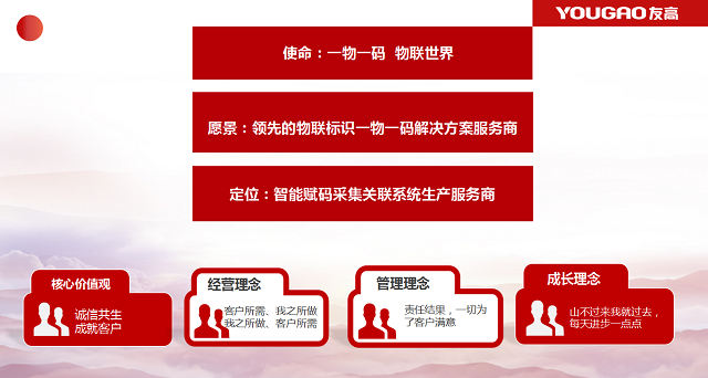 在眾力眾智之下,友高有信心在五年內(nèi)成為國內(nèi)物聯(lián)網(wǎng)標(biāo)識行業(yè)標(biāo)桿企業(yè),成為智能賦碼檢測采集關(guān)聯(lián)系統(tǒng)優(yōu)質(zhì)的生產(chǎn)服務(wù)商。