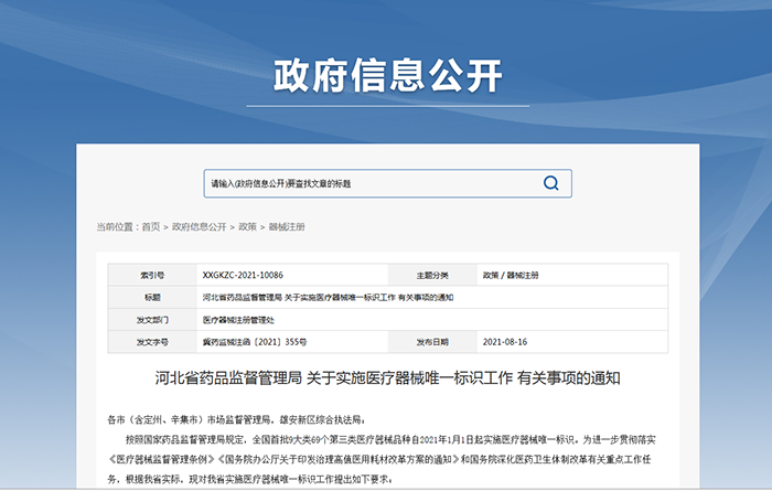 為進一步貫徹落實《醫(yī)療器械監(jiān)督管理條例》《國務院辦公廳關于印發(fā)治理高值醫(yī)用耗材改革方案的通知》和國務院深化醫(yī)藥衛(wèi)生體制改革有關重點工作任務,根據(jù)河北實際,河北決定在9大類69個品種的基礎上,將本省生產(chǎn)的第三類醫(yī)療器械(含體外診斷試劑)產(chǎn)品全部納入唯一標識實施范圍。支持和鼓勵其他醫(yī)療器械品種實施唯一標識。