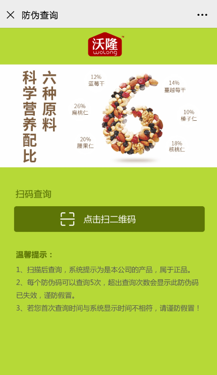 堅果炒貨行業(yè),通過一物一碼技術(shù),全面升級數(shù)字化運營體系,溯源、防偽防竄、營銷結(jié)合應用,綜合效能,有利于企業(yè)掌控整個渠道,鞏固產(chǎn)品在市場在競爭中的優(yōu)勢。沃隆堅果通過對生產(chǎn)過程中產(chǎn)品賦碼及流通銷售信息的監(jiān)管,工作人員可對每一件產(chǎn)品的身份賦碼、物流、信息流進行跟蹤追溯,從而實現(xiàn)對產(chǎn)品從生產(chǎn)、入庫、銷售、流通、分銷、防偽防竄的管理和控制。對于普通消費者而言,通過微信掃一掃功能,掃描包裝上的二維碼,即可進行真?zhèn)尾樵儭?/span>
